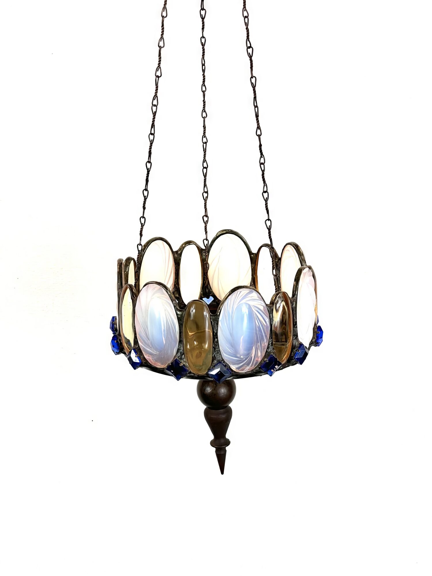 Opal-Gläser im Jugendstil geschlif­fen, abwech­selnd mit glat­ten Kristall- Glassteinen und blau­en vier­ecki­gen Steinen.