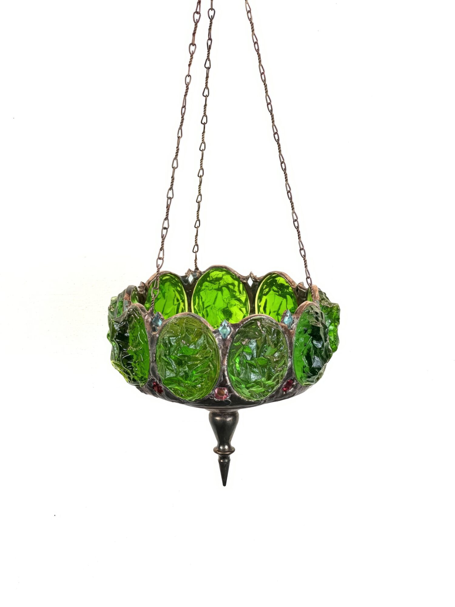 Smaragdfarbene Berglandschaft mit klei­nen rosa Strasssteinen und rau­ten­för­mi­gen, aqua­far­be­nen Strasssteinen.