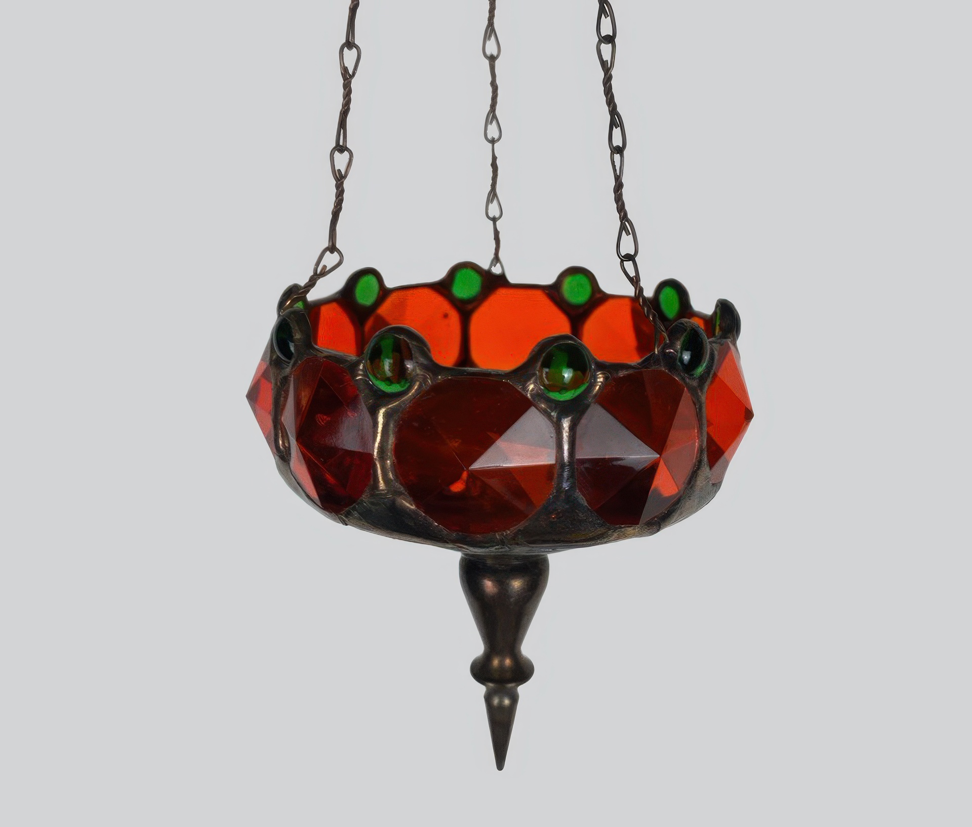 Achteckige Steine in Orange im Sonnenschliff, mit klei­nen grü­nen run­den Steinen.