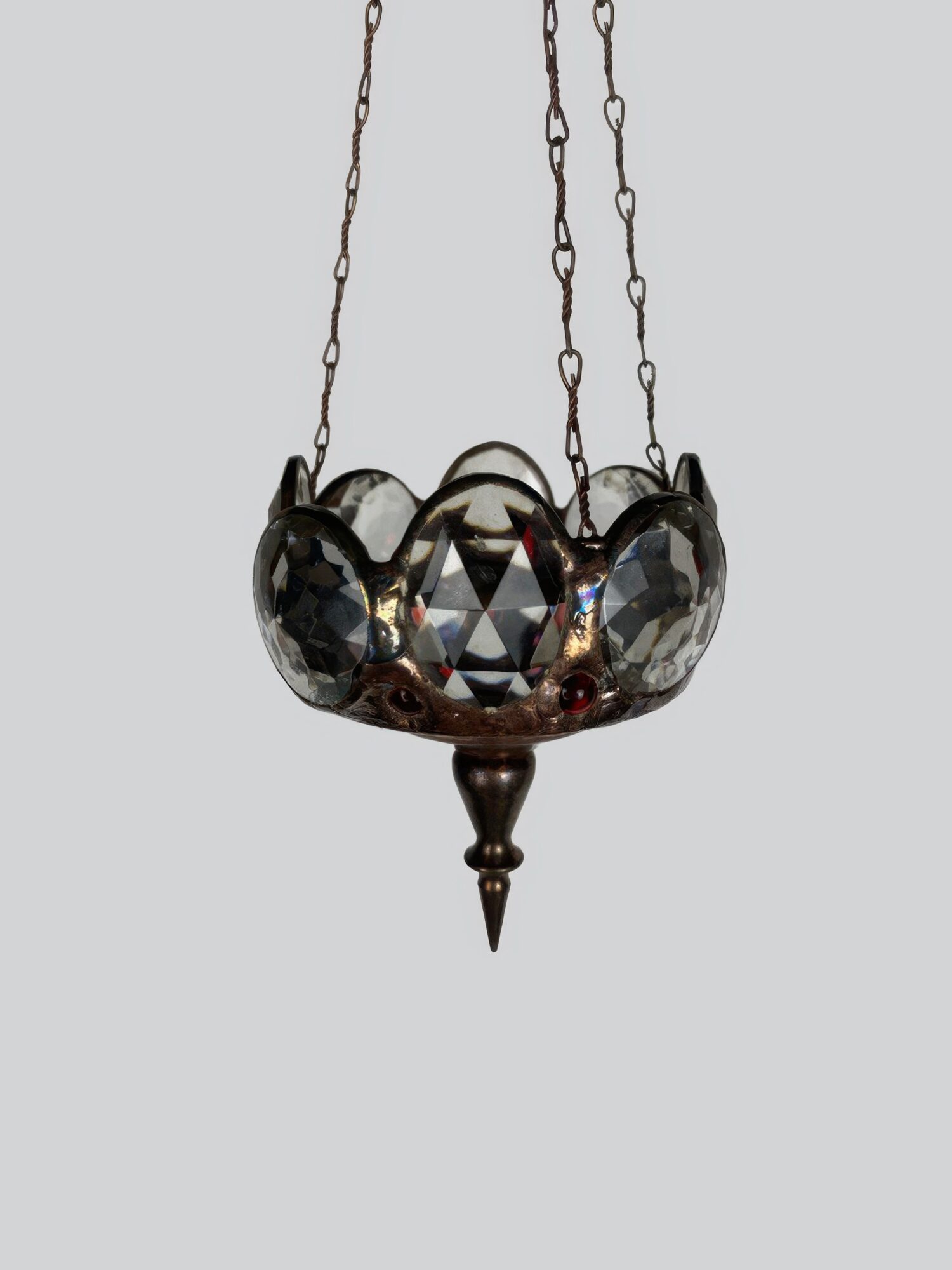 Abwechselnd run­de Steine im Brillantschliff und ova­le cris­tall Glassteine mit klei­nen roten, run­den Steinen.