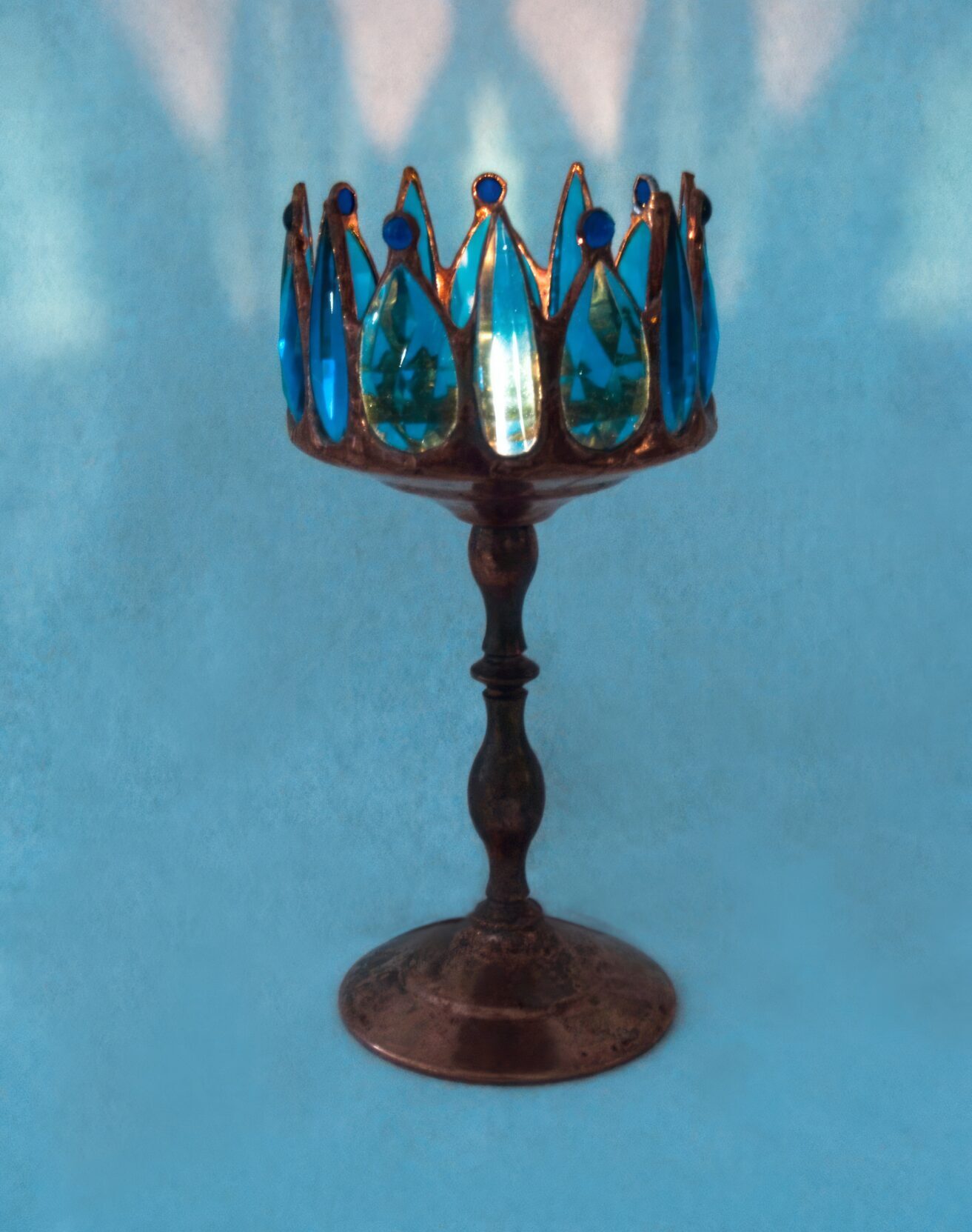 Höhe 19 cm, Fuß und Stiel mas­siv Messing. Ø 9 cm ..