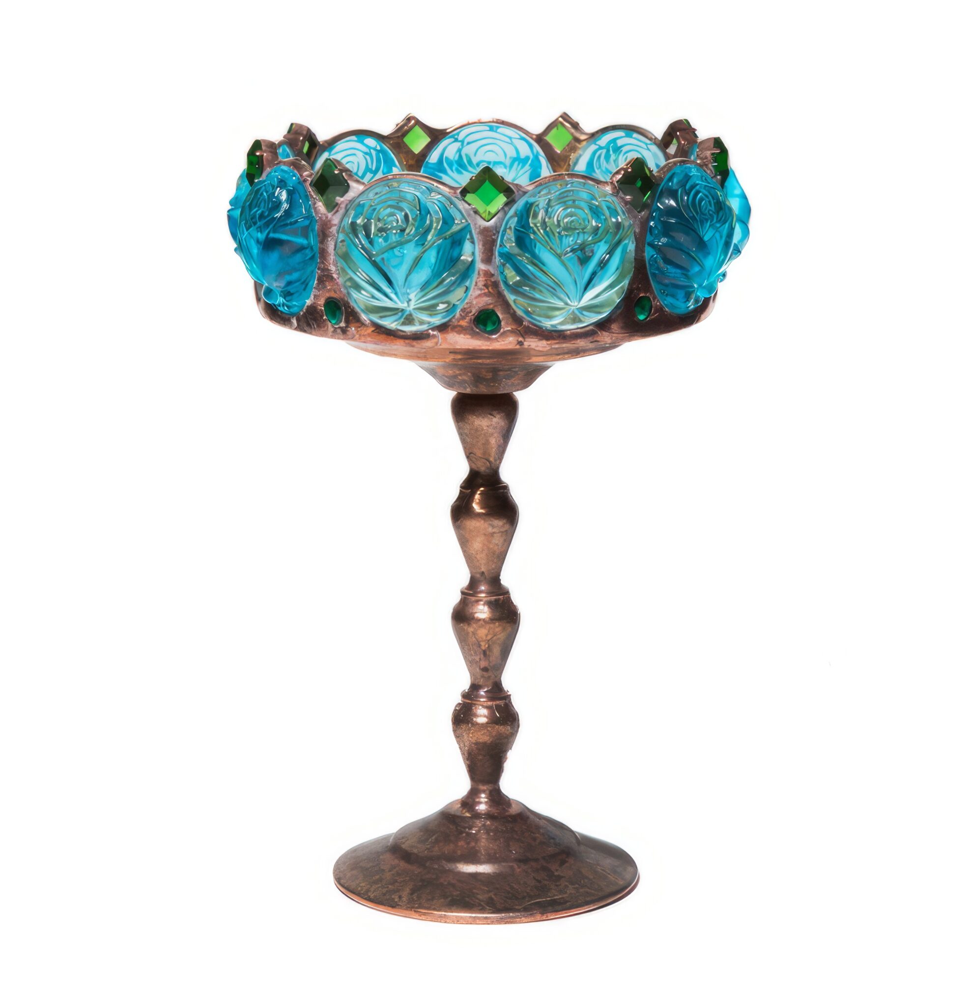 Aquafarbene Rosensteine mit kl. grü­nen Strasssteinen und vier­ecki­gen sma­ra­ged- far­be­nen Steinen.