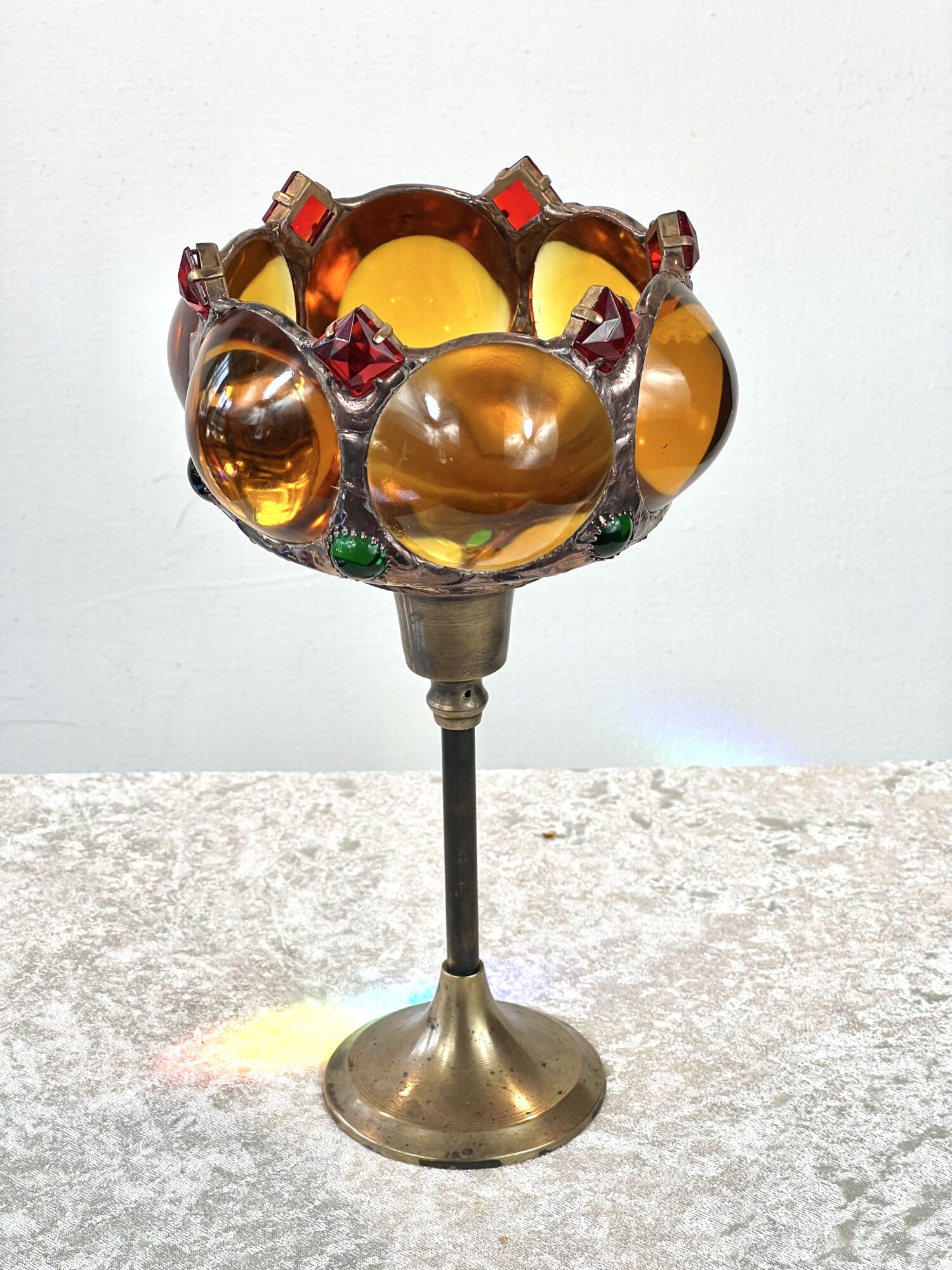 Stehlampe: Bernsteinlampe auf gedreh­tem Messingfuß.