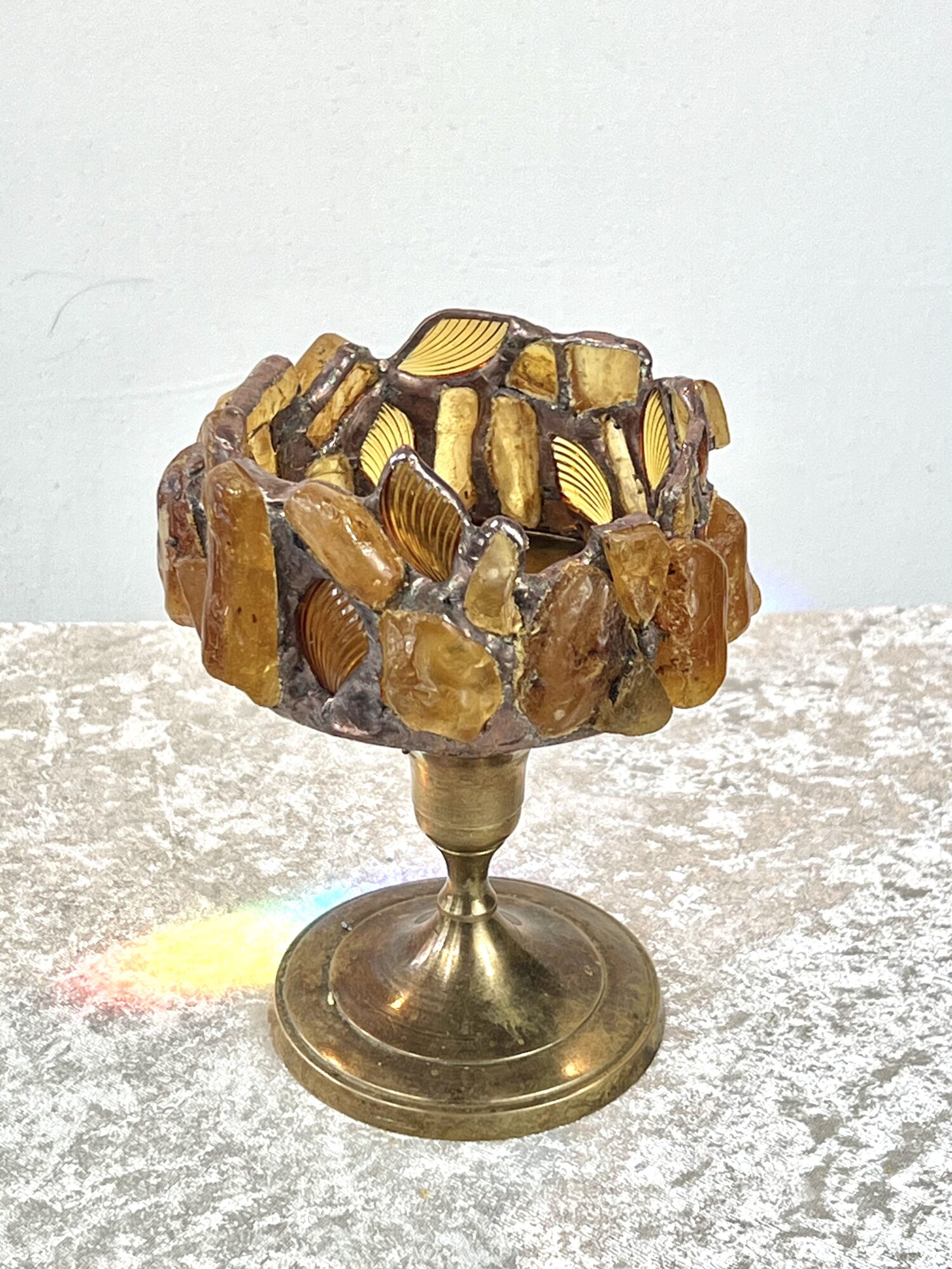 Stehlampe: Bernstein kom­bi­niert mit Gläsern in topas im Muschelschliff.