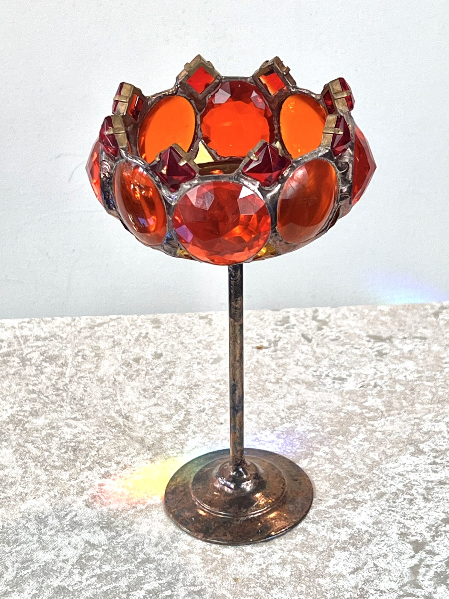 Stehlampe: Orange run­de Körpersteine mit vier­ecki­gen roten und drei­ecki­gen Topassteinen.