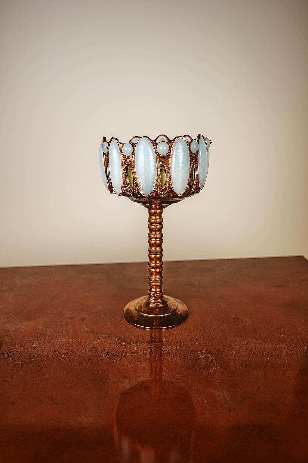 Stehlampe mit lang ova­len Gläsern in opal und klei­nen hell­grü­nen spit­z­ova­len Steinen und klei­nen run­den Opalgläsern.